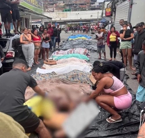 A Praça da Penha, na zona Norte do Rio de Janeiro, amanheceu com uma fila de corpos estendidos em uma lona na manhã desta quarta-feira (29).