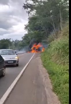 Um caminhão com 530 sacas de café tombou e pegou fogo na rodovia ES-080, em Águia Branca (Noroeste do Espírito Santo), na tarde de domingo (16).