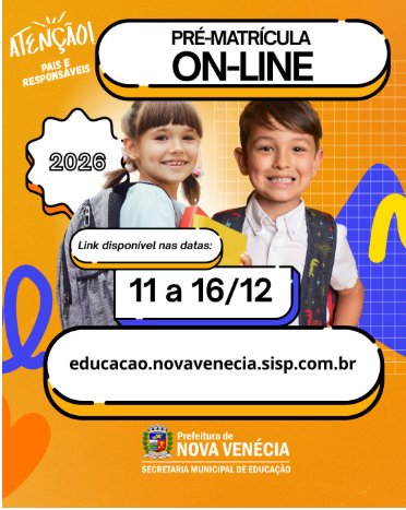 Sem filas, sem espera e sem a necessidade de enfrentar longas horas nas escolas, a Prefeitura de Nova Venécia, por meio da Secretaria Municipal de Educação, dará início no período de 11 a 16 de dezembro às matrículas on-line para a rede municipal de ensino, marcando um novo momento de modernização e praticidade no acesso à educação no município.