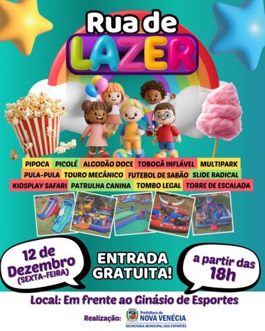 A Prefeitura de Nova Venécia, por meio da Secretaria Municipal de Esportes, promove na próxima sexta-feira (12), o projeto Rua de Lazer, um evento gratuito e voltado para toda a família. A programação terá início às 18h, em frente ao Ginásio de Esportes, e promete uma tarde e noite repletas de atividades recreativas e esportivas.