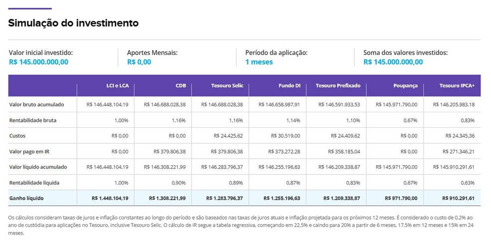 Rendimento mensal de R$ 145 milhões pode ser de R$ 910,2 mil na poupança só no primeiro mês, mas pode ultrapassar R$ 1,4 milhão em opções bem conservadoras de renda fixa. Sorteio será neste sábado (28)