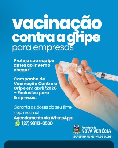 A Prefeitura de Nova Venécia, por meio da Secretaria Municipal de Saúde, realizará em abril de 2026 a Campanha de Vacinação Contra a Gripe voltada exclusivamente para empresas do município.