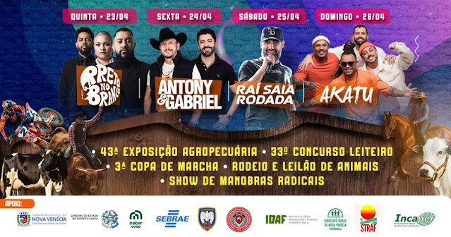 A Prefeitura de Nova Venécia, por meio da Secretaria Municipal de Cultura e Turismo, definiu as atrações que subirão aos palcos entre os dias 23 e 26 de abril, durante a Festa da Cidade, em comemoração aos 72 anos do município.