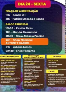 Se o primeiro dia foi inesquecível, a programação desta sexta-feira (24) promete elevar ainda mais a temperatura. É dia de sertanejo bruto! A grande atração da noite é a dupla nacional ANTONY E GABRIEL, dona de hits que arrastam multidões.